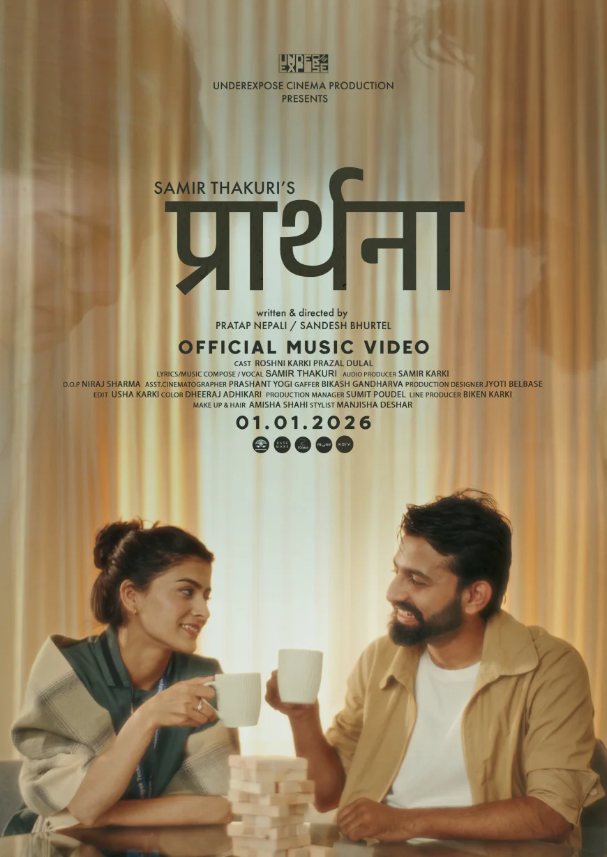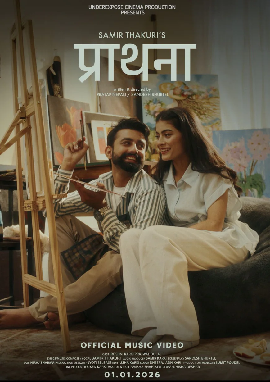 नया वर्ष २०२६ को अवसरमा “प्रार्थना” नामक नेपाली संगीत भिडियो भोलि साँझ ४ बजे सार्वजनीक हुने भएको छ । नयाँ वर्ष २०२६ को अवसरमा सार्वजनिक हुन लागेको म्युजिक भिडियो ‘प्रार्थना’ ले दर्शकमाझ उत्सुकता जगाउन थालेको छ। यस म्युजिक भिडियोको टिजर र पोस्टर हालै सार्वजनिक भइसकेका छन्, जसले सामाजिक सञ्जालमा सकारात्मक चर्चा पाइरहेको छ। रोश्नी कार्की र प्रजल दुलाल मुख्य भूमिकामा देखिने ‘प्रार्थना’ एक भावनात्मक कथामा आधारित म्युजिक भिडियो हो। यस भिडियोको कथा, लेखन तथा निर्देशन सन्देश भुर्तेल र प्रताप नेपालीले संयुक्त रूपमा गरेका हुन्। कथा एक युवकको दृष्टिकोणबाट प्रस्तुत गरिएको छ, जहाँ एक युवक र युवतीको सम्बन्धलाई तीन फरक चरण (फेज) मार्फत देखाइएको छ।